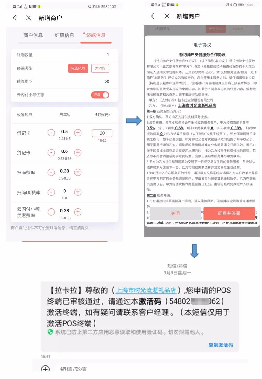 填写注意事项:1、开户行需手动输入关键字,然后在对应页面选择正确的支行信息。开户支行信息能搜索到的请务必准确填写,以免影响入账;2、若“提示银行账户未通过系统校验”,请核实入账姓名+身份证号+身份证有效期+银行卡号+开户行名称是否与上传的附件图片一致;3、上传的结算账号必须为商户注册人本人的银行卡号,为了保证您的款项可以正常入账,请使用本人名下的一类卡进行绑定(如需确认银行卡类型建议咨询发卡行核实)。第三步:选择终端类型,同意并签署商户电子协议提交审核,审核成功获得激活码填写注意事项:1、终端类型:注册电签POS终端类型处必须选择“电签POS”,否则会导致机器无法激活,如遇到此类情况建议联系您的办理人员重新进件;2、云闪付小额优惠:云闪付小额优惠开启后,使用云闪付APP二维码进行消费,1000以内手续费按照0.38%收取;3、提交审核后系统会在一个工作日内审核完毕,若超过对应时效建议查看注册页面进行排查或咨询办理人员核实。