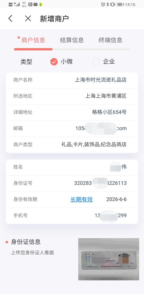 填写注意事项:1、商户类型:小微用户选则“小微”、营业执照用户选则“企业”;2、注册人姓名或注册商户名称中间带特殊字符的,建议在中文字符下录入,其他的不建议带任何特殊符号;3、身份证末位若为“X”需大写。身份证有效期必须真实填写,有效期为长期的身份证无需选择具体日期,点击“长期有效”按钮即可;4、小微商户名称填写请遵循地级市+商户简称主营,名称不能以有限公司命名;例如“上海市时光流逝礼品店”,注册手机号作为验收激活码使用,不支持修改,请务必填写正确。第二步:填写商户结算银行账户信息